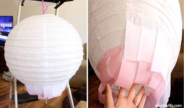 – Hang the paper lantern up for the rest of the steps (I know from experience, holding the huge lantern and gluing crepe paper is NOT easy)