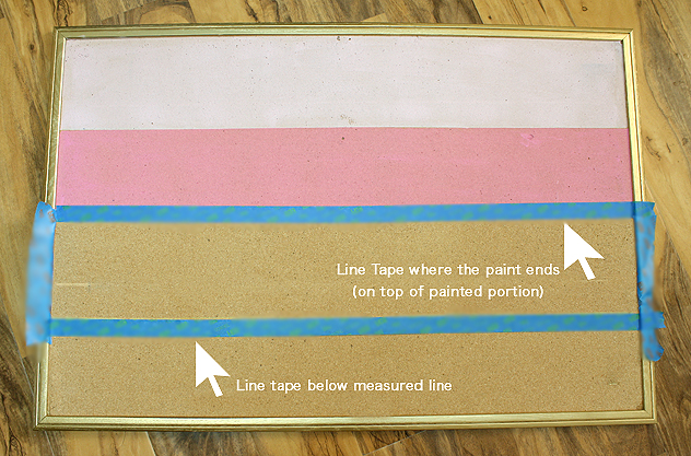 – Measure the cork board area you are painting. My cork board was a standard size which was 22.5 inches. Since I chose 4 colors, each color portion had to be the annoying measurement of 5.625 (I would have preferred an easier number to find on my straight edge!)