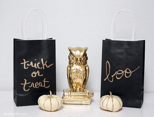 When I was working on one of my Thanksgiving DIYs, I thought… why not a glam treat bag for Halloween?? While I like the spooky Halloween favors, I would love something more adult and glam for my party- and these gold treat bags are it!