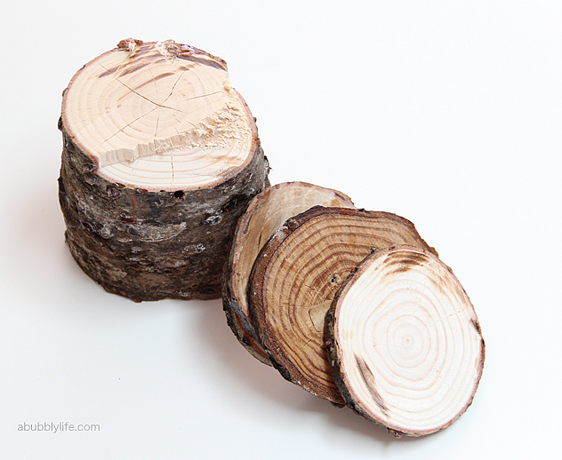 Cut wood log into approximately 2 inch slices using a miter saw. (The log you see below broke when my husband tried another saw, so stick with the miter 😉