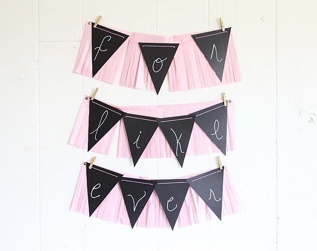 The chalkboard banner comes with baker’s twine (yeay!) String the twine through the holes and attach to fringe banner using glittered clothespins, tape, or glue.