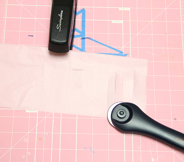 Using the rotary cutter, start slicing on top if the self healing mat. You can use the measurements on the mat to make your cuts all the same size or eyeball it (as I did)