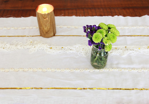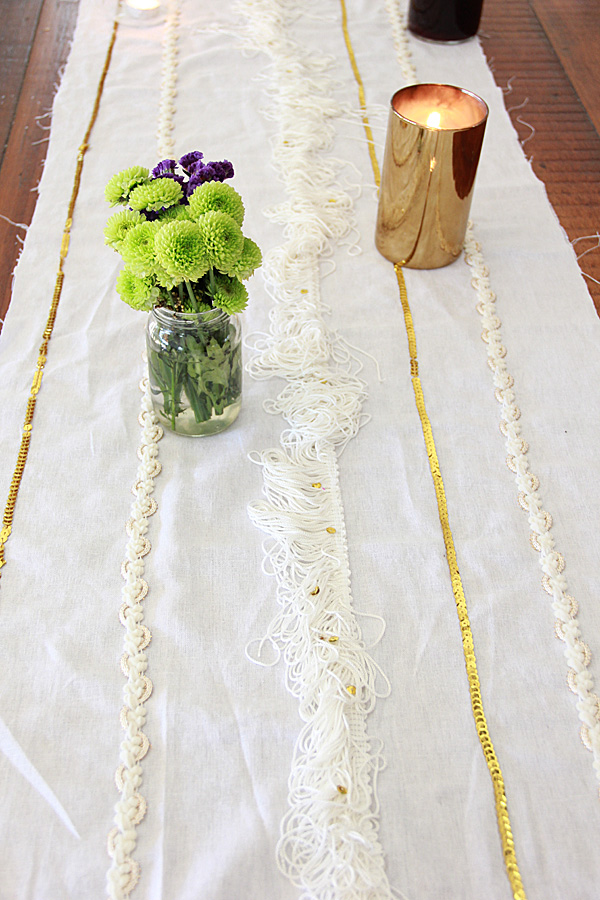 This is very loosely based on the Moroccan Wedding Blankets that I just adore. It has fringe and sequin, but I added additional trim I liked and used gold to match the look for my Thanksgiving table. The wedding blankets I have seen seem to only use silver sequins, but have you met me? I love gold.