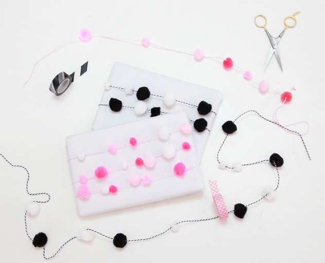 It is no secret how much I love pom poms! Two years ago I made some pom pom gift wrap for Christmas and this year I decided to add some baker’s twine and make it into a garland as well!