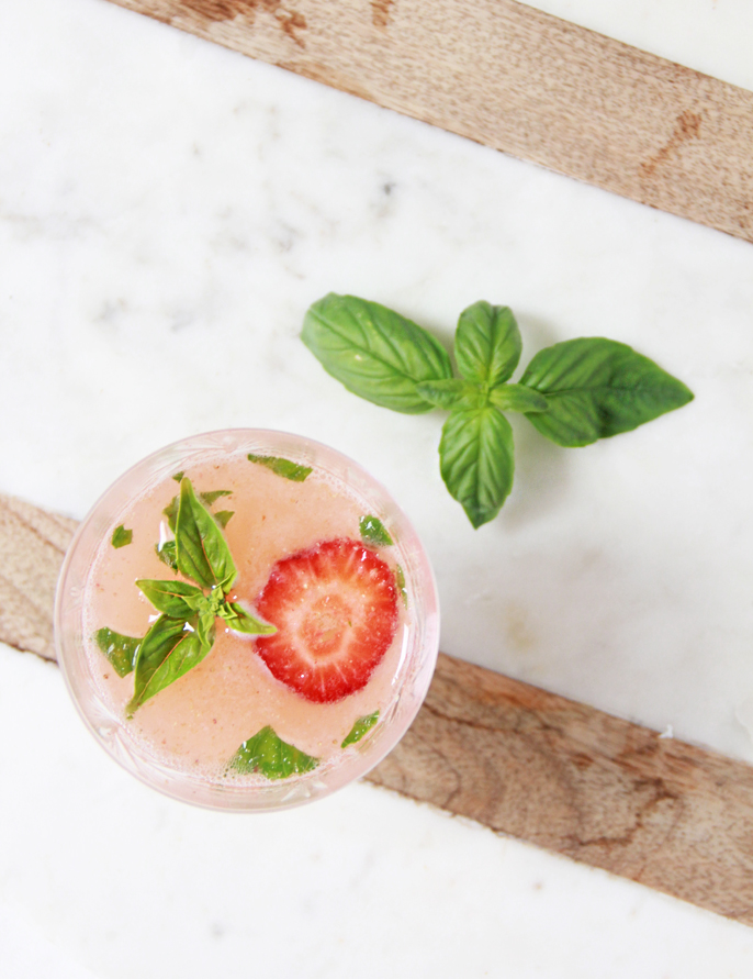 Garnish with basil and a strawberry slice.