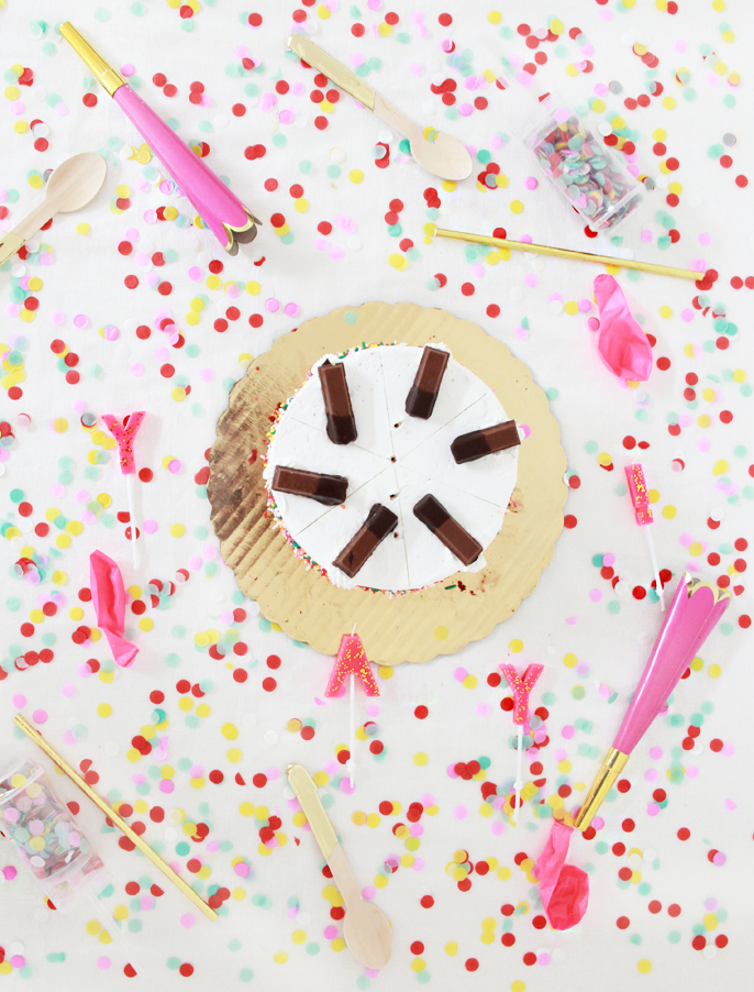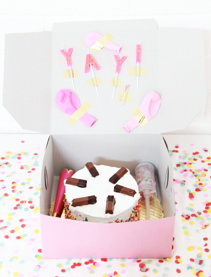 Inside I added the delicious Cold Stone Creamery cake and beside it laid some confetti shooters and party horns!