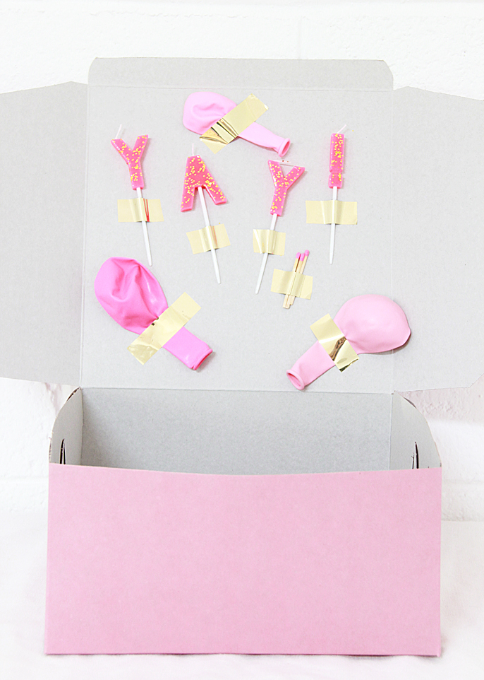 Then I opened the box and taped candles, matches, balloons to the lid!