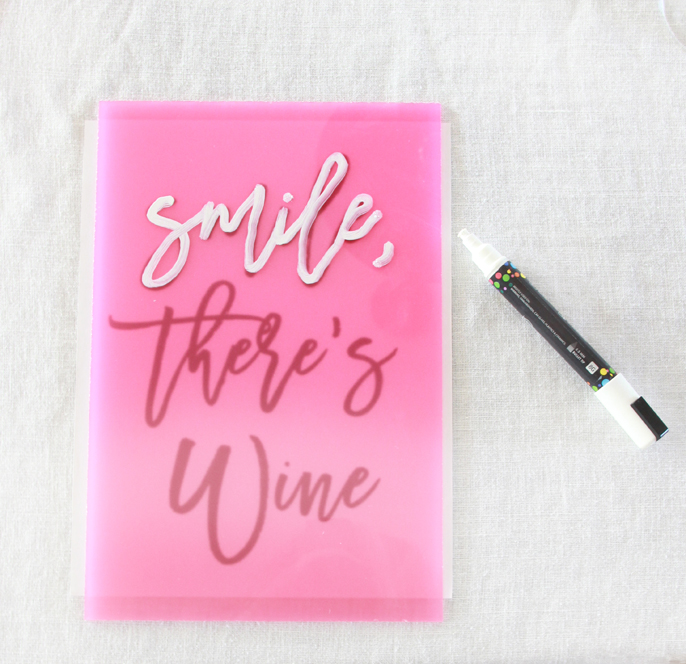 Place paper under the acrylic sheet and trace! With chalk markers, press firmly down to get as much chalk as possible, it looks better with a paint pen, but I want to reuse the signs and used a chalk marker.