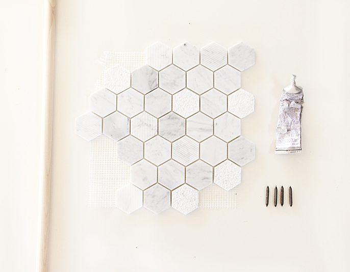 Glue wood dowel to back of an individual marble tile (they come off from the large tile very easily) and let dry.